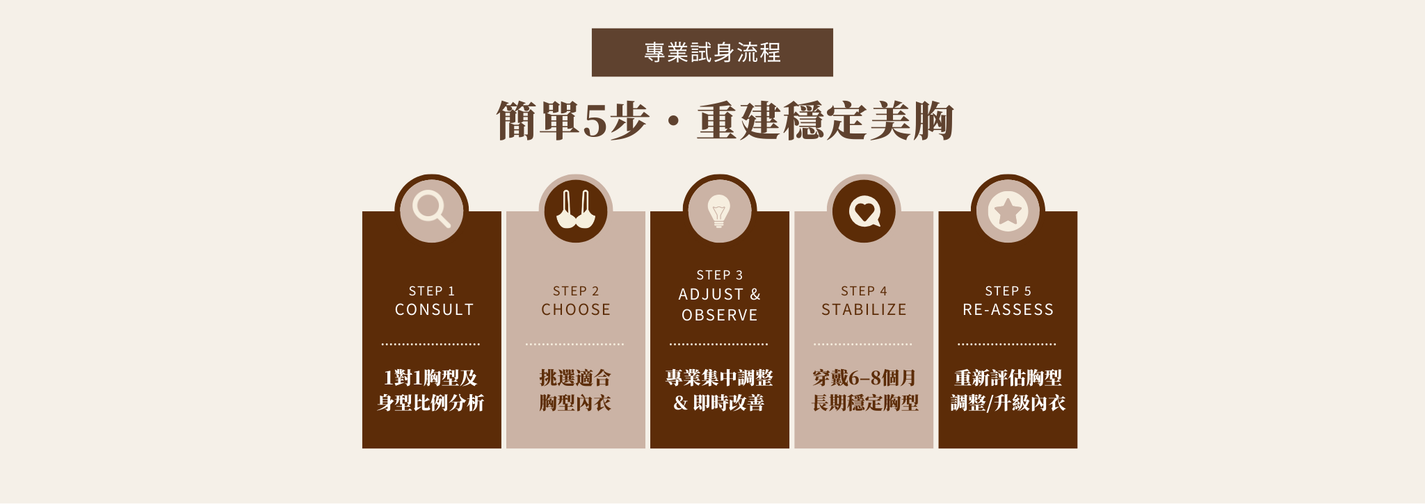 當胸型在穩定支撐下逐步改善,原有內衣未必完全適合你。6–8 個月後重新評估,是為了配合胸型變化,確保美胸效果能持續,而非單純更換內衣。